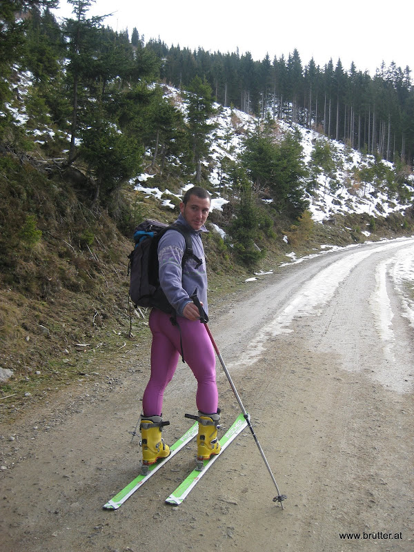 Als Testtour wählten wir einen Klassiker. Die Saison ist noch jung, die Beine noch schwer, der Große Gamsstein entsprach unserer heutigen Reichweite. Bis zum Weiderost war der Loasweg befahrbar. Die Naunz schaute ziemlich aper herunter, der Weg war aber bis zum Loassattel von tragfähigem Eis/Schnee bedeckt. Bis zum Kleinen Gamsstein folgten wir einer alten Spur, von da an herrlich jungfräulicher Schnee. Die ersten schweißtreibenden Spitzkehren dieses Winters waren ein guter Test der Funktionalität der neuen Hosen. Was soll ich schreiben, sie haben sich bewährt. Die Abfahrt ins Maschental war nicht ganz so optimal, aber was solls.