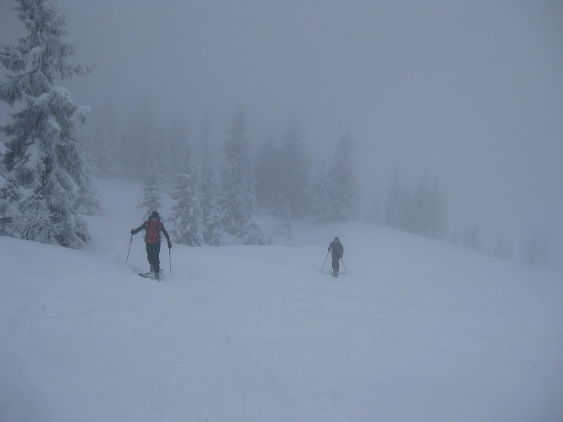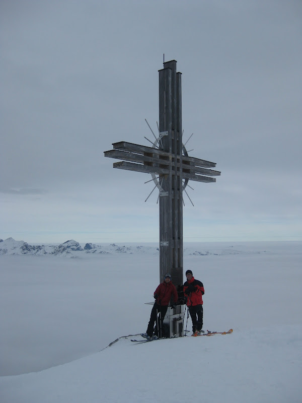 IMG_0022.JPGWir spurten dagegen über mehr oder weniger abgewehte Rücken und tief eingewehte Rinnen weiter. Der Knackpunkt der Route befindet sich direkt unterhalb des Graukopfes, wo es einen steilen Hang zu überwinden gilt. Matthias übernahm dankenswerter Weise die Spurarbeit. Unter unheilschwangeren Wächten fanden wir trotz äußerst diffuser Lichtverhältnisse die optimale Route. Am Gipfel angekommen waren wir dann doch relativ erschöpft…